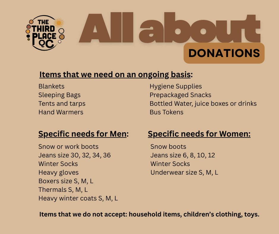 At The Third Place QC, Inc., your support is invaluable in helping us create a sense of community, warmth, and dignity for those experiencing homelessness and housing instability. There are several ways you can contribute to our mission and make a positive impact: